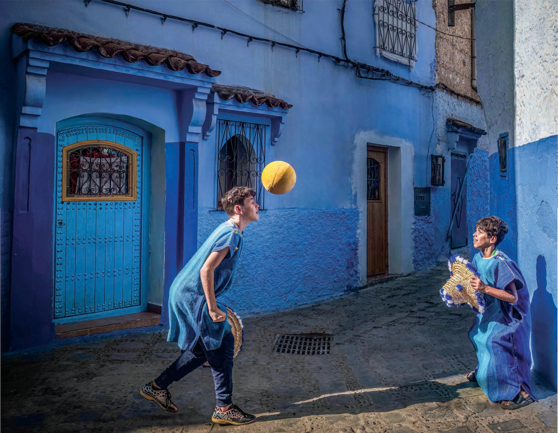 Equipment is minimal. Boots and shin guards offer a degree of comfort and protection. But in towns around the world, barefoot children chase a ball or, absent financial resources, duct tape around a wad of fabric. Whatever the setting, the ball has a magnetic pull. Soccer in the sand will set one’s calf muscles screaming, yet beaches everywhere offer ample space for impromptu play. Two young friends in Morocco can do drills in a nook by their home. Concrete and blacktop aren’t optimal for the game, yet footballs skitter across these surfaces just the same as in a 1930s photo from London, where kids prepare to play outside Lyons, a purveyor of pastries and tea.