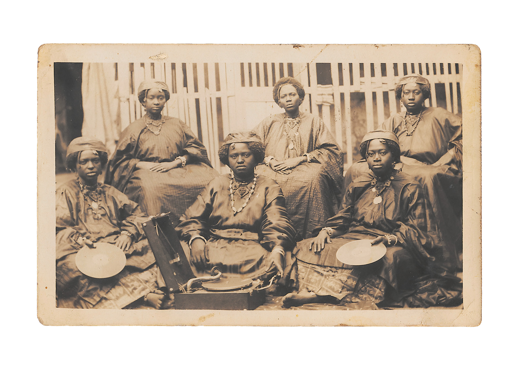 Unknown artist’s “Group Portrait With Record Player,” c. 1920s-1930s, postcard-format gelatin silver print, 7 inches by 4½ inches (17.8 cm by 11.4 cm).