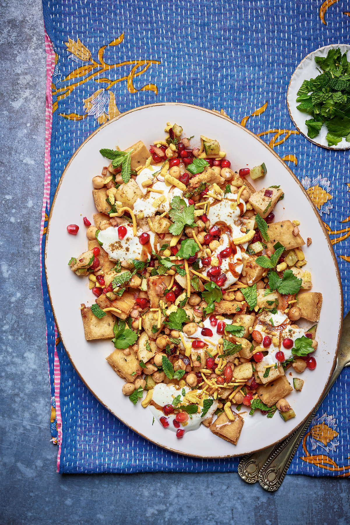 On a large serving plate, begin assembling the chaat. Start with a layer of papri or fried pita, then add the chickpea mixture. Dollop spoonfuls of yogurt all over and add a generous drizzle of tamarind sauce, the Bombay mix, extra pomegranate seeds and the rest of the fresh herbs. Finish with a big dusting of chaat masala.