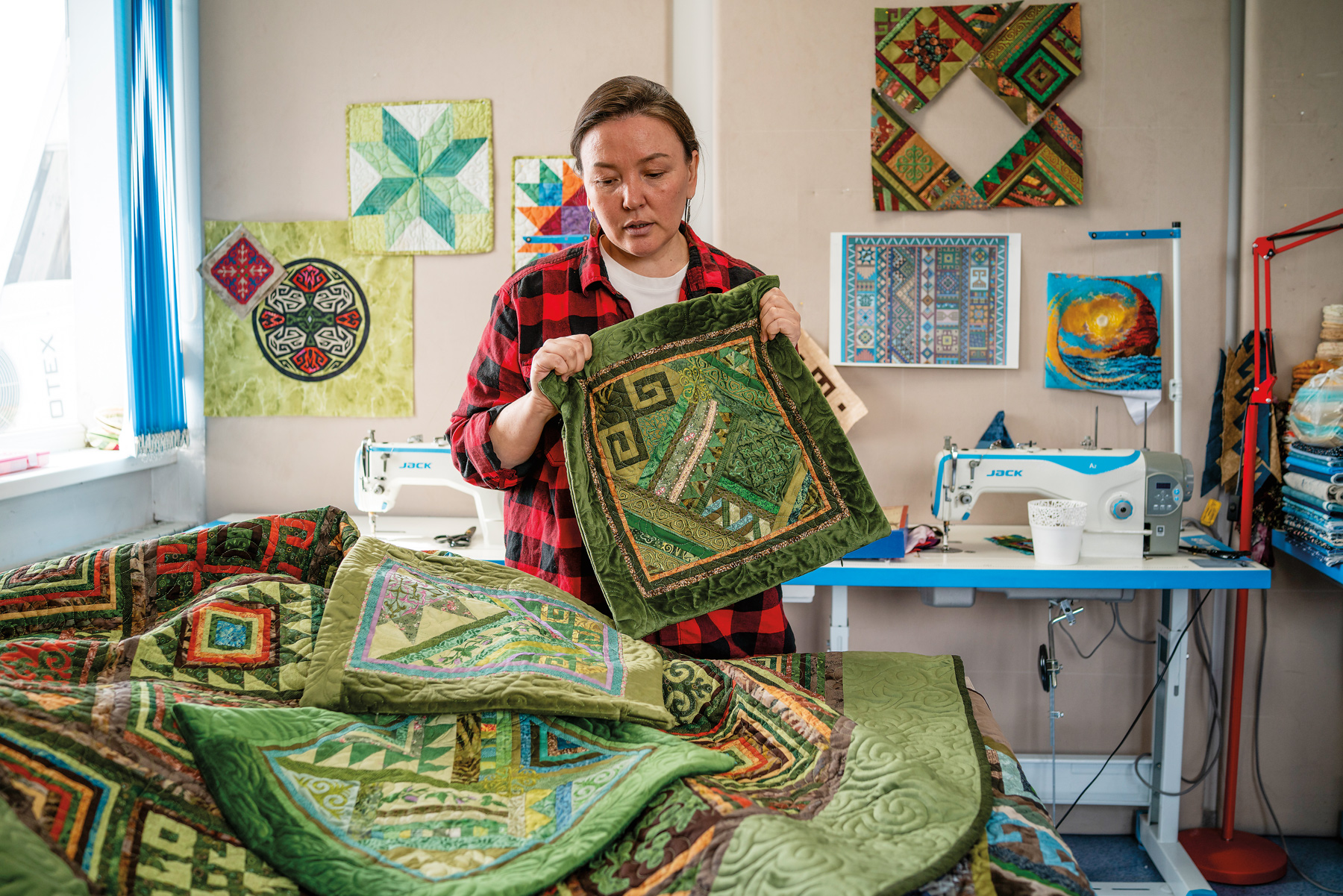 In her studio, behind a desk laden with brightly colored blankets, Ualikhan describes how she tries to restore the value of the patchwork tradition.