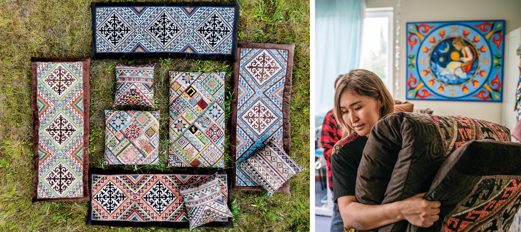 Left: Gulmira Ualikhan shows kurak pieces at her workshop. Right: Kurak employs measured, straight blocks of geometric patterns.