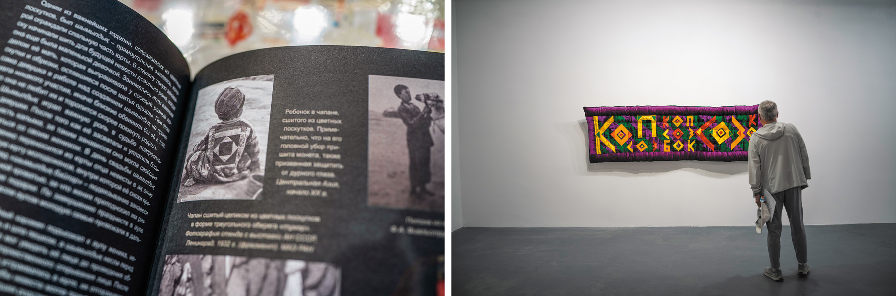 Left, a bookstore selling Erily Ospanuly’s Ethnographic Atlas of Kazakh Ornament and, right, “Köp söz bok söz” by artist Munar Abdukakharov, on display at Aspan Gallery.