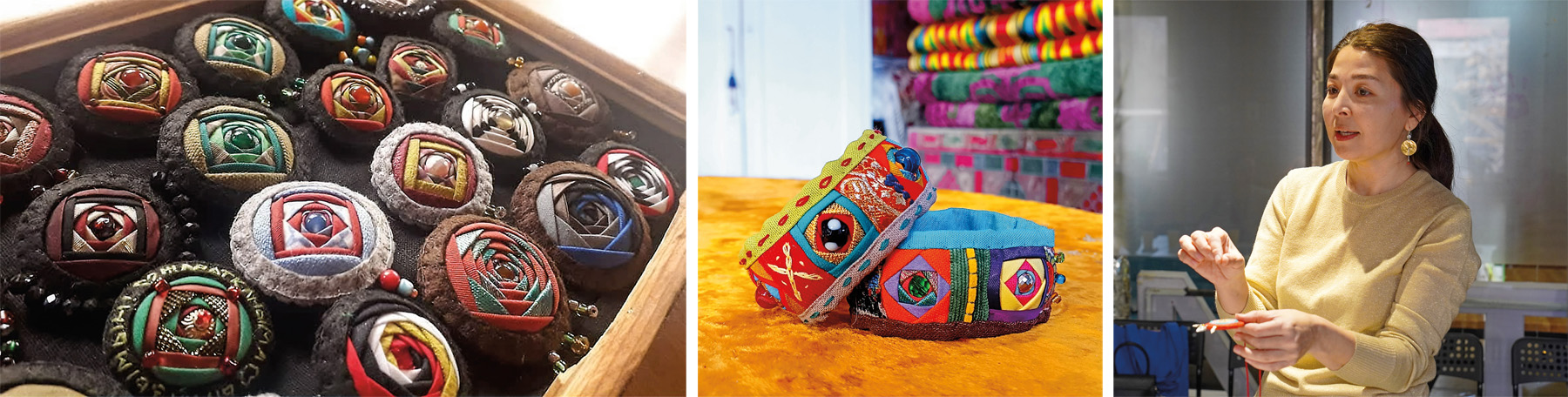 Her amulets, brooches and bracelets embrace vivid colors. Though she mostly sews them in the traditional form of a well, they rather resemble a budding flower or an eye.