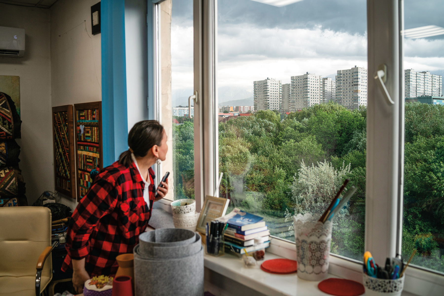 Ualikhan’s studio overlooks the foothills of the Zailiysky Alatau Range in Kazakhstan.