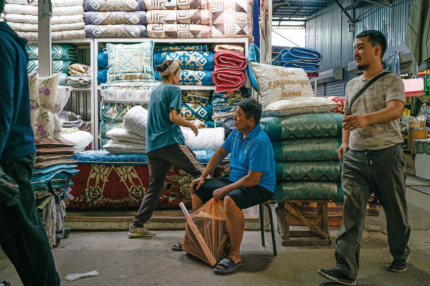 Vendors sell kurak kurpe—traditional quilted blankets, mattresses and other goods—at Arlan Bazaar in Almaty.