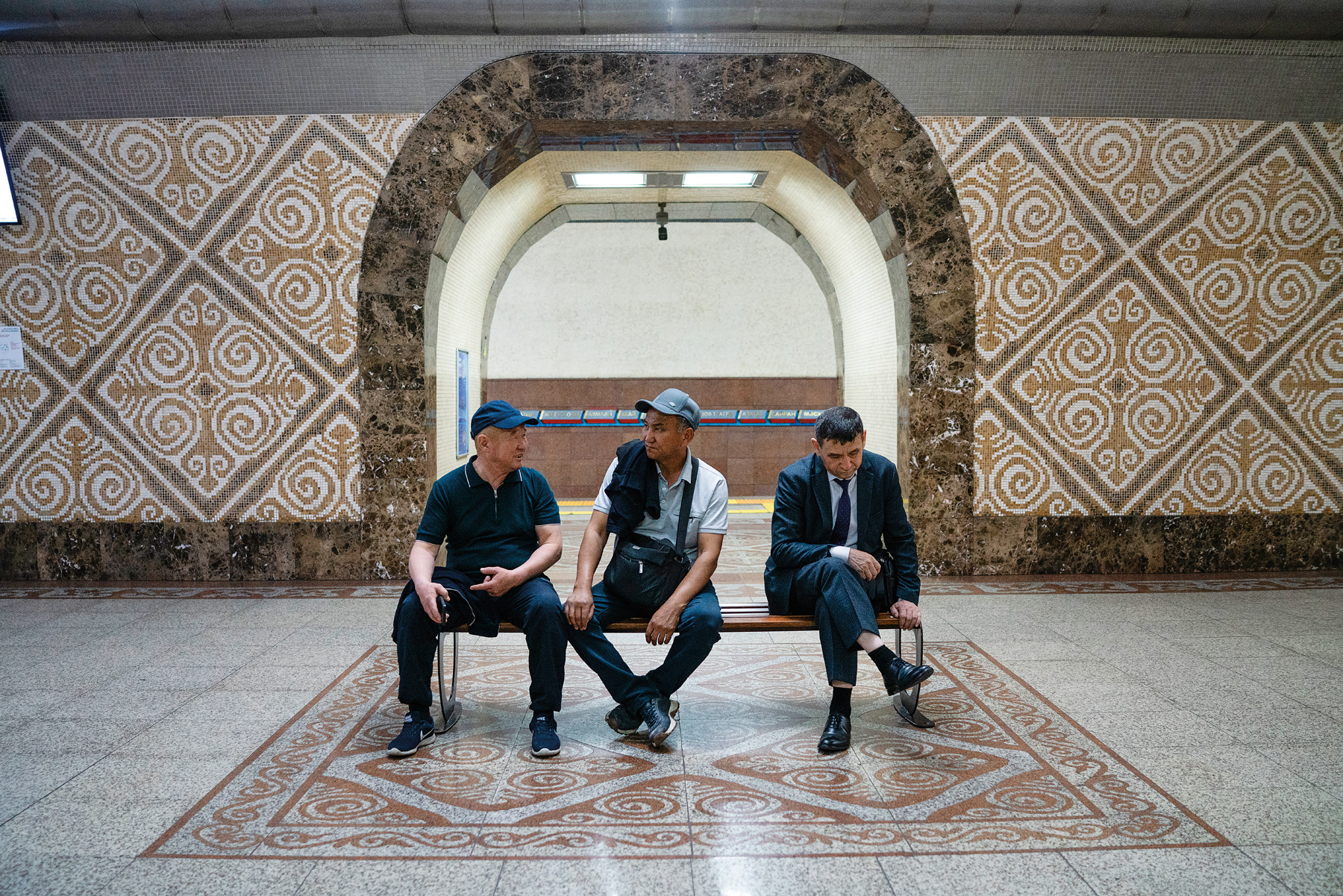 Kurak patterns are woven into everyday life in Almaty, including the walls and floor of a metro station,