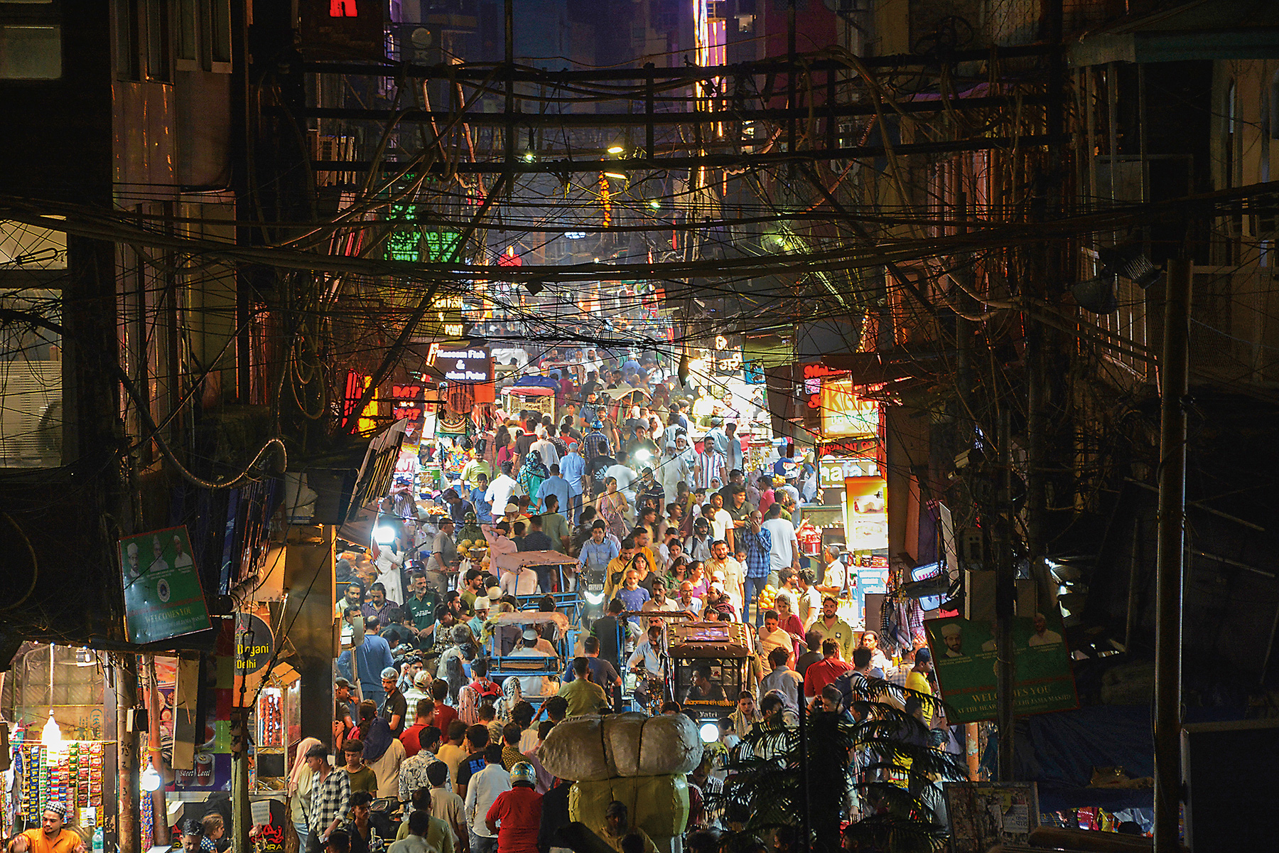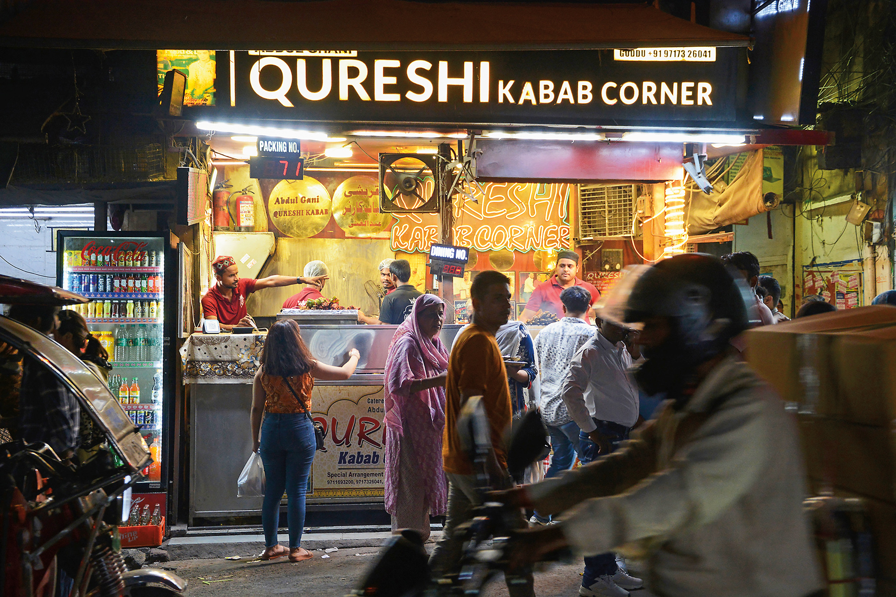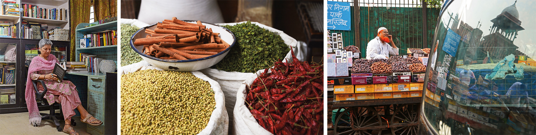 Left: Historian Rana Safvi says it was important for rulers in the sultan’s era to “balance strength with refinement.” Center: The use of spices, here on display at the Khari Baori wholesale spice market, remains largely the same as in the time before Mughal and Deccan courts. Right: A dry-fruit seller works amid Delhi’s bustling streets. Such fruits accompany milk cream in age-old specialties such as khoya samosa.