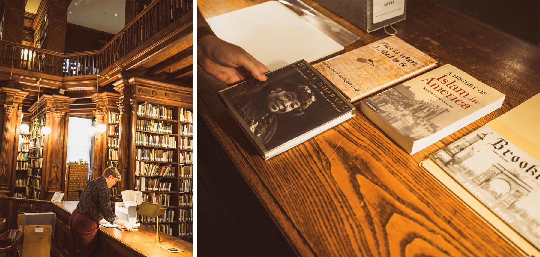 Left The Othmer Library archives manager Dee Bowers finds in a 1929 atlas that the building that became the Powers Street Mosque once was home to the Democratic Club of the 13th assembly district under Brooklyn’s old political ward system. Right The library contains various reference materials concerning Brooklyn and American Islamic history.