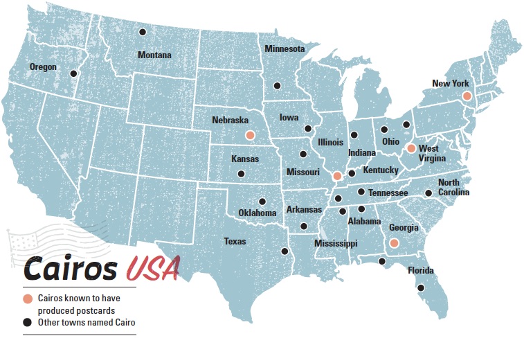 Across the United States, more than two dozen towns bear the name Cairo, inspired by Egypt’s capital. Five of them—Cairo, Illinois; Georgia; West Virginia; New York; and Nebraska—produced picture postcards in the early 20th century. Once a leading form of communication, these cards now offer a visual record of towns that aspired to grandeur, invoking ancient Egypt to brand themselves with bold futures.