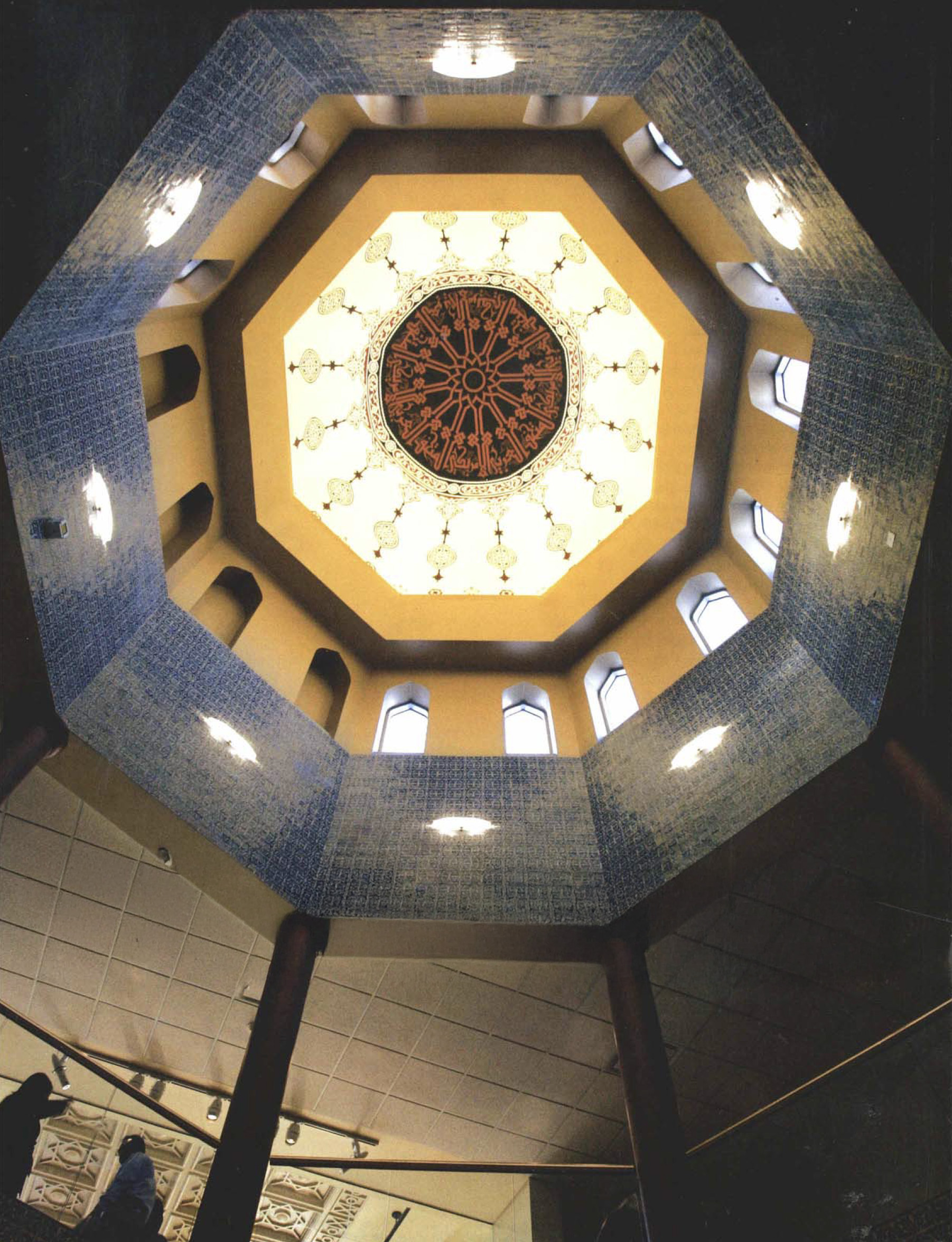 The new three-story museum sits on what was formerly the site of a long-abandoned furniture store. Clad in polished Canadian marble and featuring a handsome fountain, the building takes on the look of what many observers describe as a “jewel box.” Panels of cast-stone arabesques enrich the interior, and the ceiling rises to a clerestory cupola above the two-story atrium, finishing with a rainbow of Moroccan tiles and Arabic calligraphy that repeats the museum’s name. The effect gives the building the look and feel of a mosque, without trying to imitate one.
