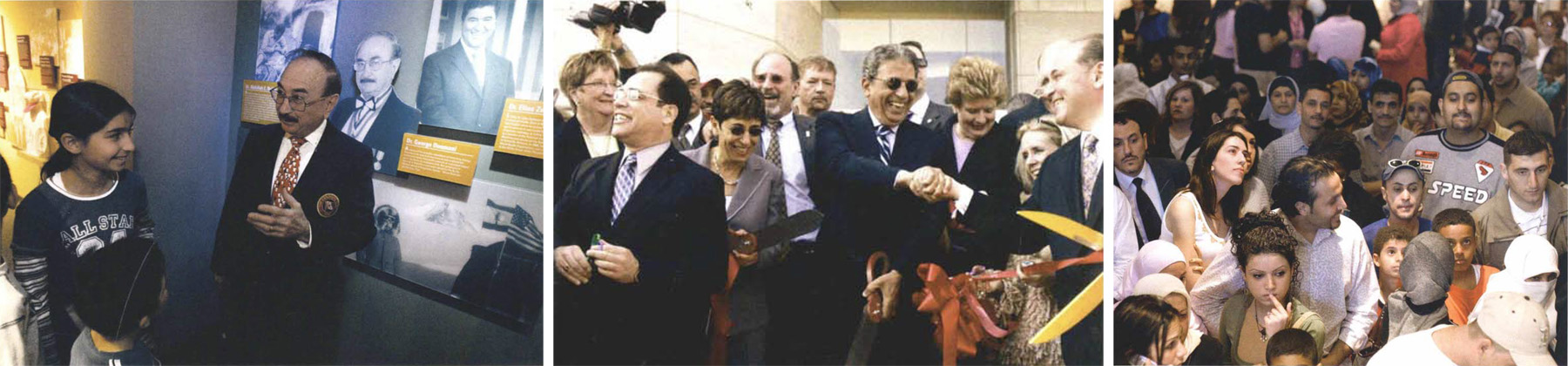 Above: On the new museum’s opening day, scientist, Antarctic explorer and almost-astronaut George Doumani captivates young visitors in front of the display honoring his accomplishments. “One of the greatest honors for me is to be recognized by my own people,” he says. Center: On May 5, with oversized scissors as ribbon-cutting props, Amre Moussa, secretary general of the Arab League, shakes hands with Dearborn Mayor Michael Guido, officially opening the Arab American nation Museum. Right: An opening-day crowd fills the museum’s lobby.