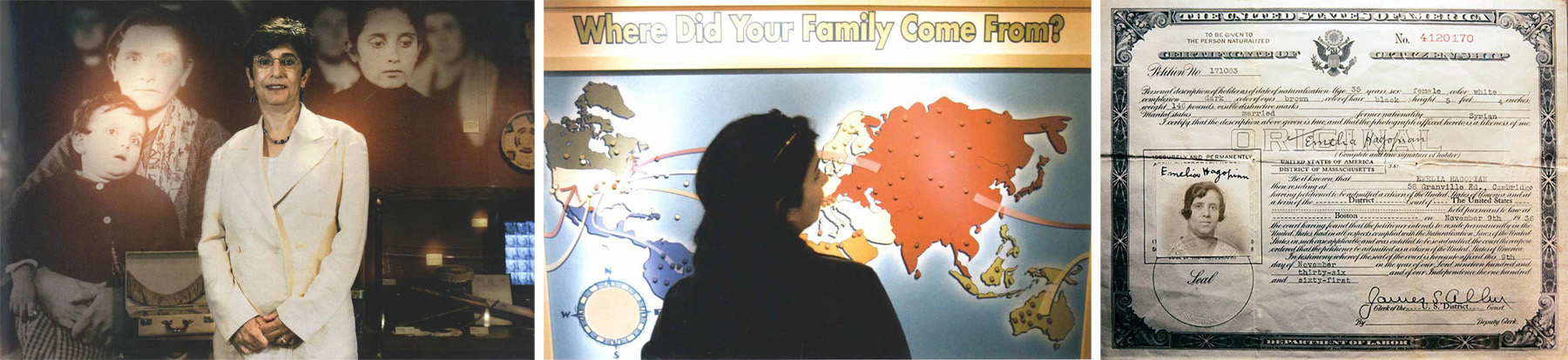 Left: “Even many Arab-Americans,” says historian and museum director Anan Ameri, “are often suprised to learn that someone well-known is of Arab-American heritage.” Ameri co-authored Arab Americans in Metro Detroit: A Political History. Center: A wall-sized map shows the major pathways and periods of Arab immigration to the Americas. Right: A 1936 certificate of US citizenship granted to Emelia Hagopian lists her prior citizenship as “Syrian.”