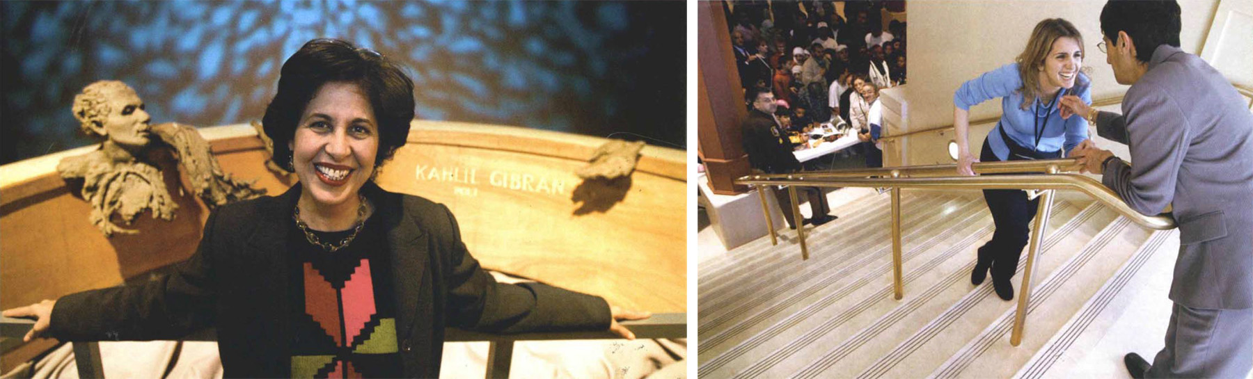 Left: Ruth Ann Skaff led much of the museum’s nationwide, five-year fundraising campaign, and she secured for display the maquette of the bust used in the Kahlil Gibran Memorial, dedicated in 1991 on Massachusetts Avenue in Washington, D.C. “I was thrilled that I was able to contact the museum and persuade them to save it and include it here,” she says of the bust of the best-known Arab-American writer. Right: Museum membership coordinator Rafeef Hajj and Ameri share a moment of celebration.