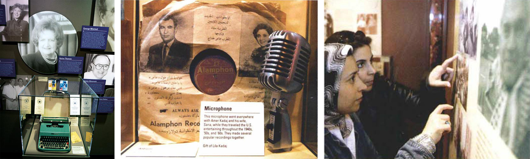 Left: Helen Thomas, long doyenne of the Washington press corps, used this typewriter for dispatches early in her career; Center: popular singers Amer and Sana Kadaj used this microphone as they toured the nation in the decades after World War II. “We’ve been collecting for more than three years,” says museum curator Sara Blannet, and “we’ve only touched the tip of the iceberg.” Right: Visitors scrutinize displays that have drawn from more than 500 personal and family artifact donations nationwide.