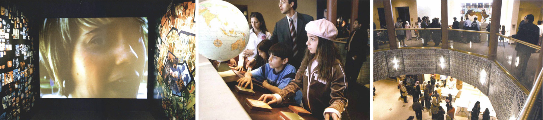 Left: One provocative gallery shows video interviews of real-life Arab-Americans on a screen that both pushes out from, and is confined by, side walls covered with common negative stereotypes of arabs and Arab-Americans. Center: Nozmi elder, 8, and his sister Madina Elder, 11, of Dearborn push buttons to illuminate parts of the interactive map of the countries of the Arab world. Right: The second story of the museum wraps around the space beneath the building’s dome.