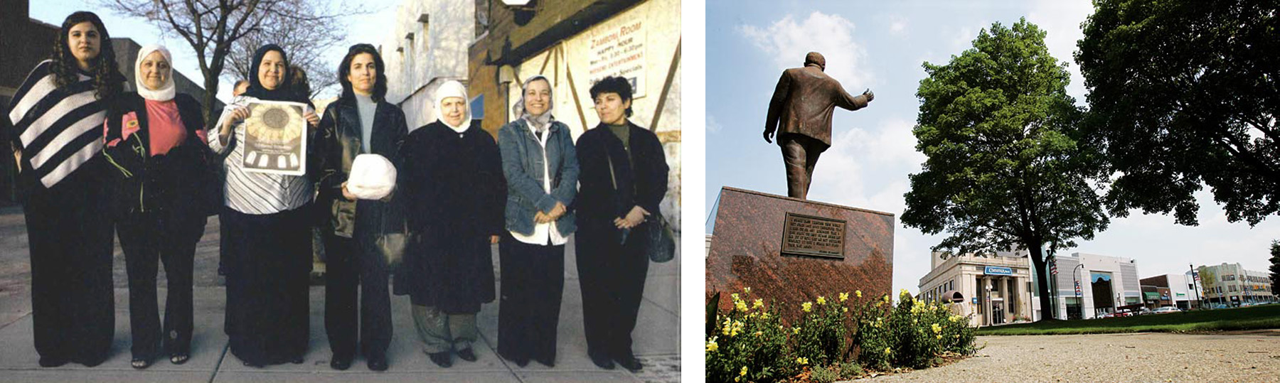 Left: Seven women who came to the museum’s opening by bus from Chicago pose on the street before heading home. Right: A statue of former Deaborn mayor Orbille Hubbard that stands in front of City Hall now appears to gesture across the street to the Arab American Museum.