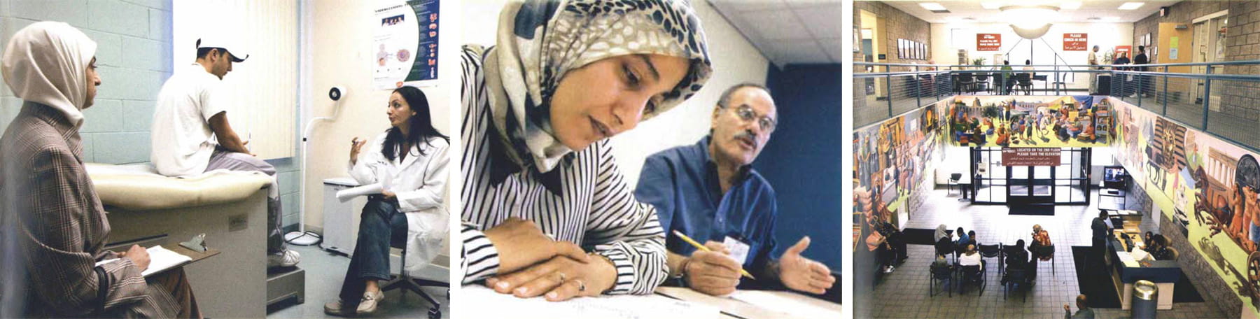 Left: Hisam Ajouz, 17, gets a pre-football season checkup from Leila Hadda, MD, at the ACCESS health clinic. Center: Sahar Al-Mosawi looks over a practice test with ACCESS bilingual counselor Adnan Almurani. Right: The lobby of the 35-year-old Arab Community Center for Economic and Social Services.