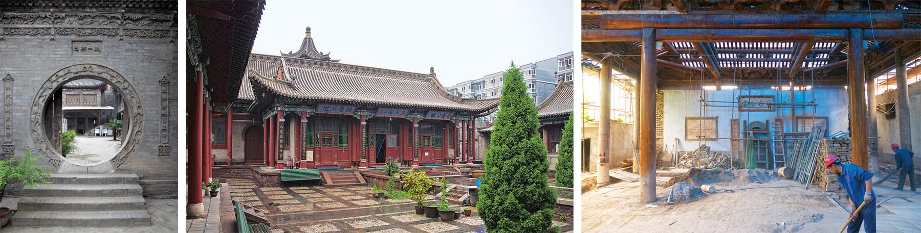 Left: Offering both an entry and a frame for the view beyond it, a circular opening in a wall is known in China as a moon gate. A common feature in gardens, it was also used in religious architecture and, as we see here, in the wall at the Great Mosque of Xian. Center: The first mosque we visited, the Xuanhua North Mosque in northwest Hebei province, shows much that typifies not only the historic mosques we saw, but also other traditional secular and religious complexes in this part of China: A central courtyard surrrounded by low halls and rooms; timber framing; a slightly raised main prayer hall; and perimeter walls of stone or brick. Right: Many historic mosques have undergone renovation in recent years, such as the Beiguan Mosque in Tianshui in Gansu province, where Arabic calligraphy has been left intact above the mihrab or prayer niche, background center.