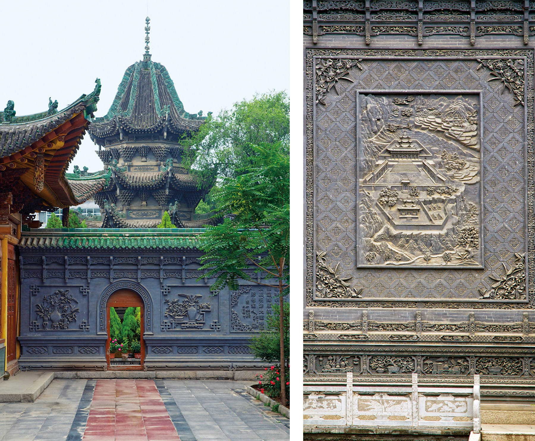 The burial sites of men who did much to introduce Islam to central China in the 18th century are marked by pagoda-like structures, such as this one at left, surrounded by buildings for worship and teaching, in Linxia, Gansu province. Little on the exteriors indicates they are historic centers of learning and scholarship. Right: A bas-relief fresco depicts the traditional central Chinese walled building complex.
