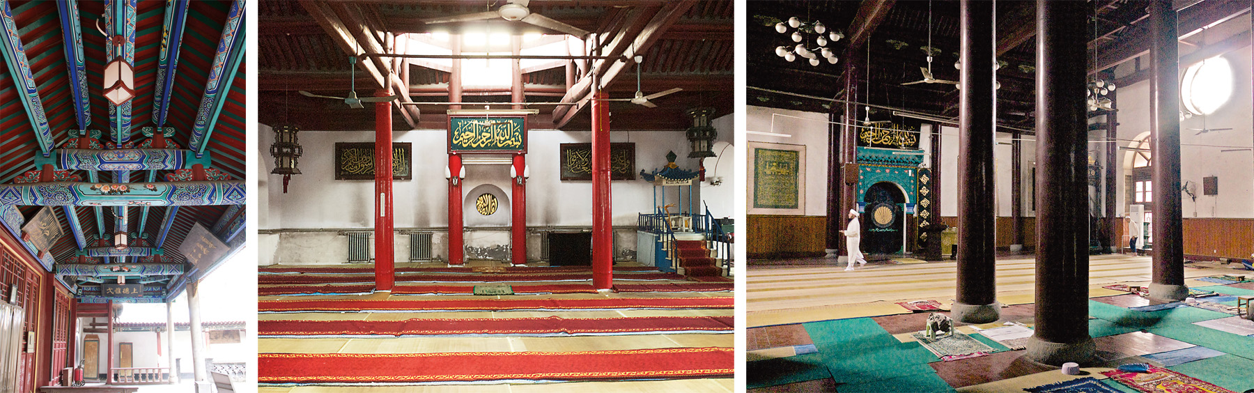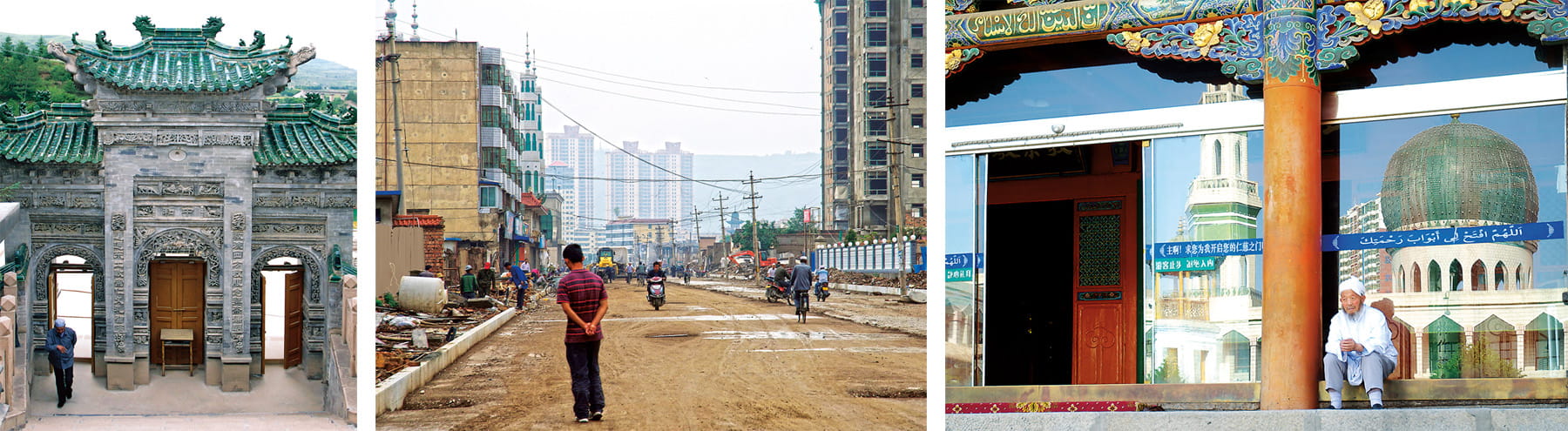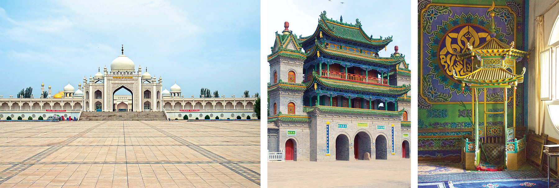 Left: The gateway to the complex at Guyuan in Ningxia Autonomous Region combines typical features of Islamic and Chinese architectural decoration: The exterior ornamentation juxtaposes Arabic and Chinese texts and motifs, incorporating flowers, fruit, birds and real and mythical animals, topped with traditionally Chinese, green-tiled roofs with curling finials shaped as fantastic beasts. Center: Minarets of a recently built and stylistically non-Chinese mosque appear down the street, visible at the left, in Linxia, which once thrived on trans-Asian Silk Road trade, and which today hosts the largest number of mosques of any city in China—more than 70, both old and new. Right: Reflected in plate-glass windows retrofitted onto the porch of the traditional Chinese-style mosque in Xining, capital of Qinghai province and the largest city on the Tibetan Plateau, are the domes and minarets of the nearby, much newer mosque built in “International Islamic” style.