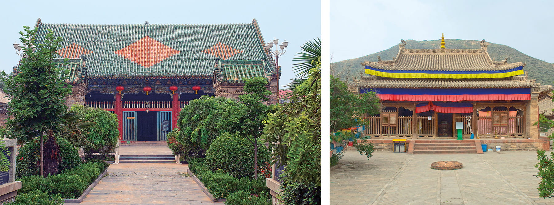 A rectangular, wooden post-and-beam structure raised on a platform with outer walls of brick and a tile roof, the Zhuxian Mosque in Kaifeng, Henan province, left, differs little from the worship hall at the Buddhist monastery at Ledu, on the Tibetan Plateau near Xining, right. At the mosque, the two small pavilions on either side of the path—which in a Buddhist setting might be drum and bell towers—here contain stelae, or upright stone slabs, chronicling the history of the mosque.