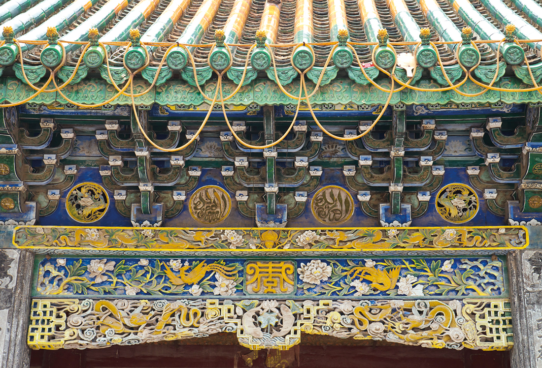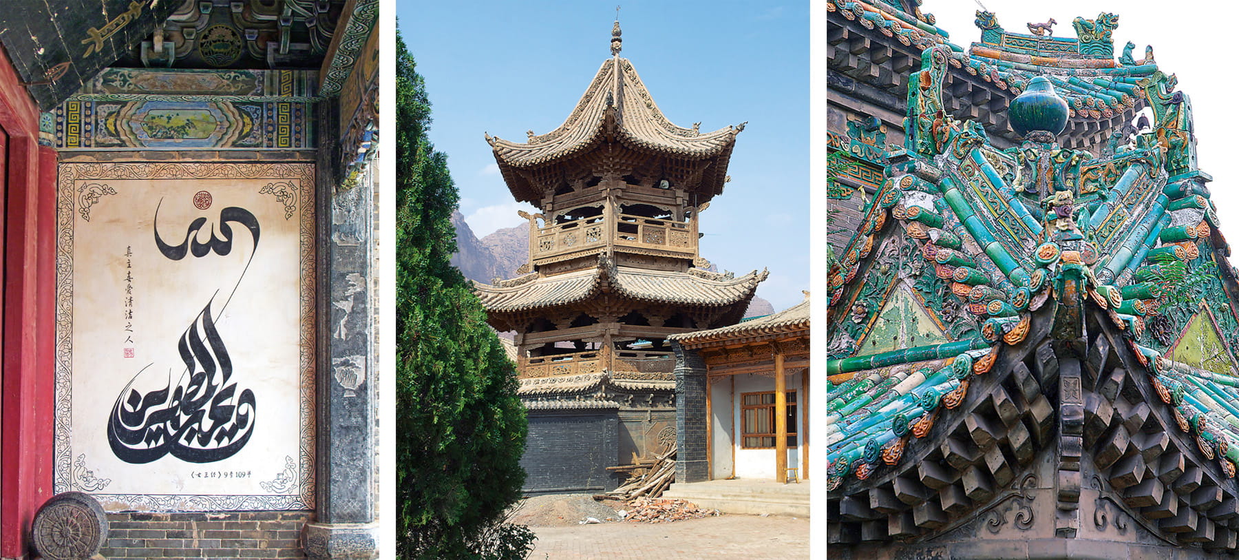 Set within a traditional Chinese frame, Arabic calligraphy, left, is often used to decorate the walls of mosques, as here at the entrance to the Great East Mosque at Kaifeng. The fluid line is typical of Chinese calligraphy, which is normally executed with a brush, rather than the reed pen used elsewhere in Islamic lands. Center: Usually located in the middle of a mosque’s courtyard, the pagoda-like wangyuelou, or “moon-watching tower,” is not a minaret, although today loudspeakers mounted on this one at Xunhua in Qinghai province show that it has been adapted to that purpose. Right: The roofs of traditional buildings in China are normally covered with glazed ceramic tiles, some of which are decorated along the ends and ridge lines with vegetal and floral motifs as well as with fantastic beasts, such as dragons and phoenixes. The ends of some of the cylindrical tiles are molded with Arabic inscriptions, while others are stamped with dragons. All of these features combine here on the roof of the Great Northern Mosque in Qinyang, Henan province.