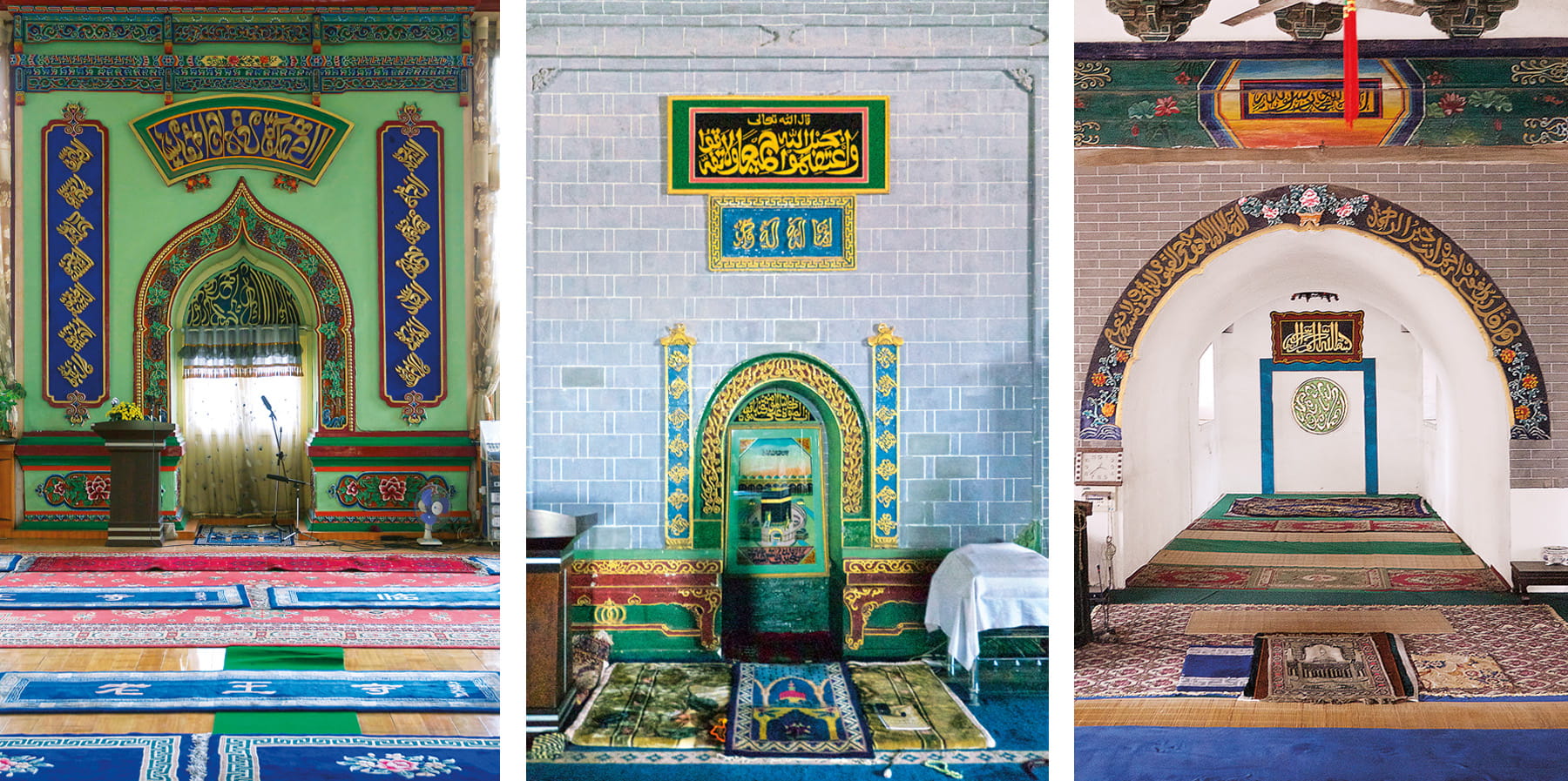 Chinese traditional architecture is generally based on timber posts and beams, and it does not normally use arches. An exception is the long association of the arch with the mihrab, the niche in the Makkah-facing wall of a mosque, which introduced this otherwise novel shape into Chinese mosques. Left to right: Mihrabs in Linxia (Old Wang Mosque), Tongxin and Dingxiang.