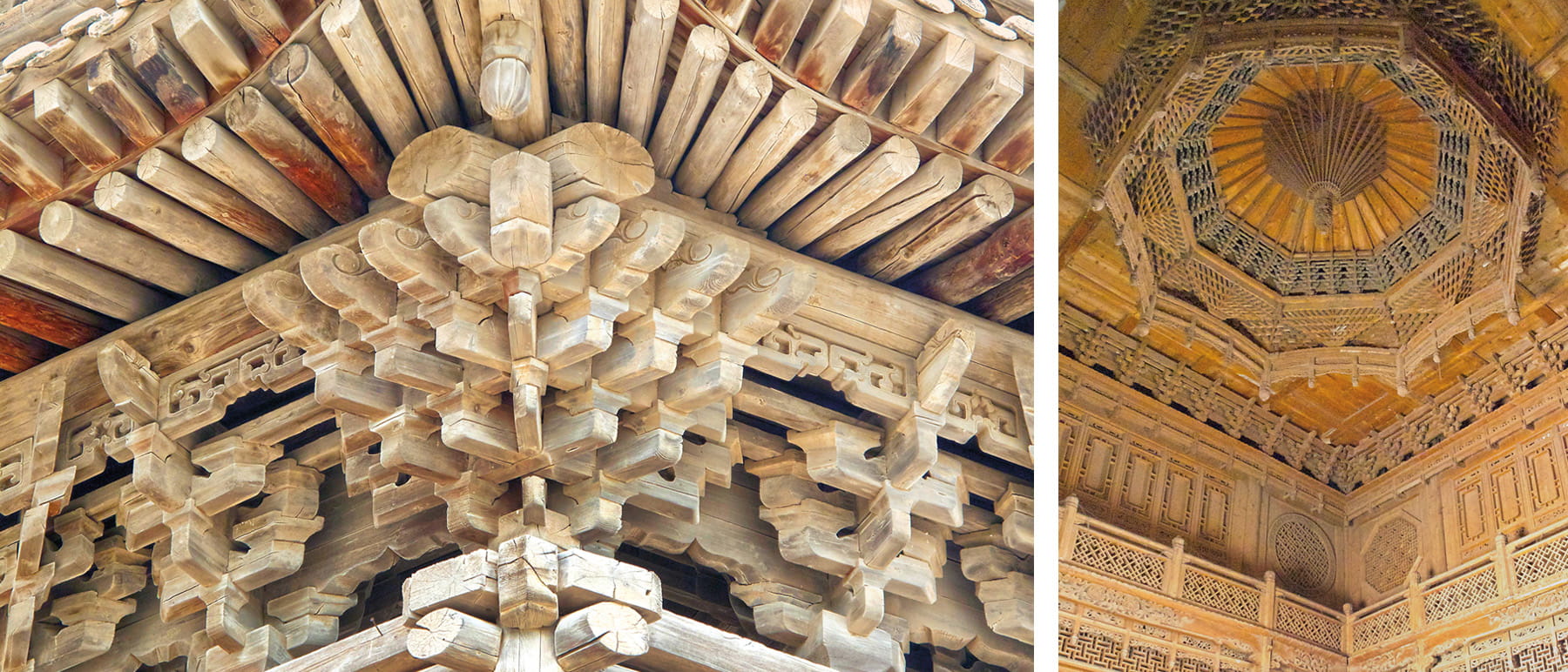 Because Chinese architecture has been so consistent over millennia, one way of dating a building is to look at the complexity of the “bracket sets,” the wooden braces that support the roof: The more complicated the bracket sets, the later the building. These at the Hongshuiquan mosque point toward the 18th or 19th centuries. Right: At the Hongshuiquan mosque, the mihrab stands in this small square room covered by exquisite carved paneling and this elaborate wooden ceiling that evokes a dome.