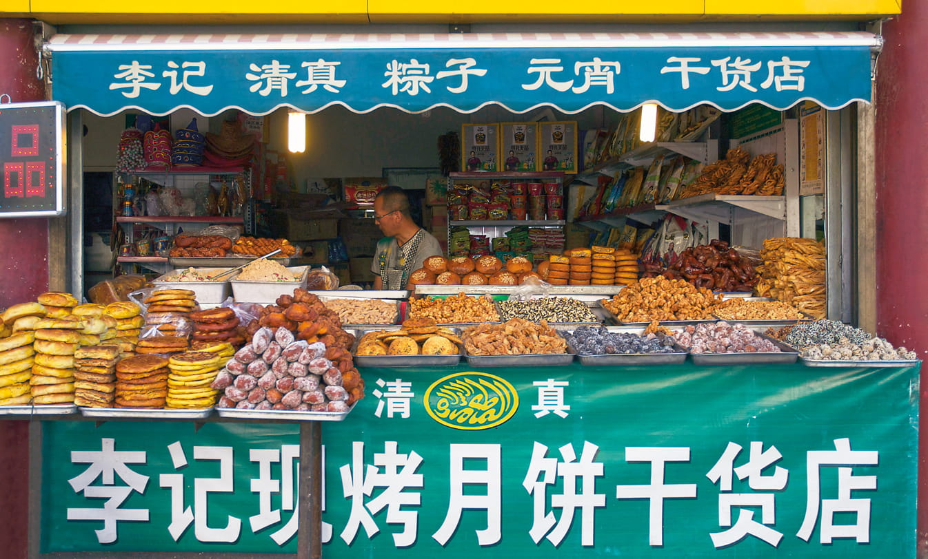At a sweet shop outside the mosque at Hohhot, capital of the Inner Mongolia Autonomous Region, the signs are mainly in Chinese characters, but the Arabic in the small oval shows that the food is halal, or permissible for Muslims. However, the Arabic letters in the oval are written incorrectly as separate characters, like Chinese.