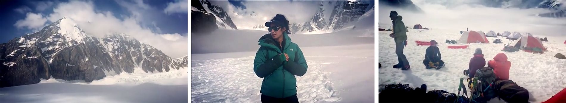 Moharrak and the team make their way from Camp Five on Denali, <em>left</em>, and continue on up to 4907 meters, <em>center</em>, where Moharrak says the air was noticeably thin. After summiting, now on their way back to basecamp, <em>right</em>, the team had to wait for freezing temperatures for safer travel among crevasses.