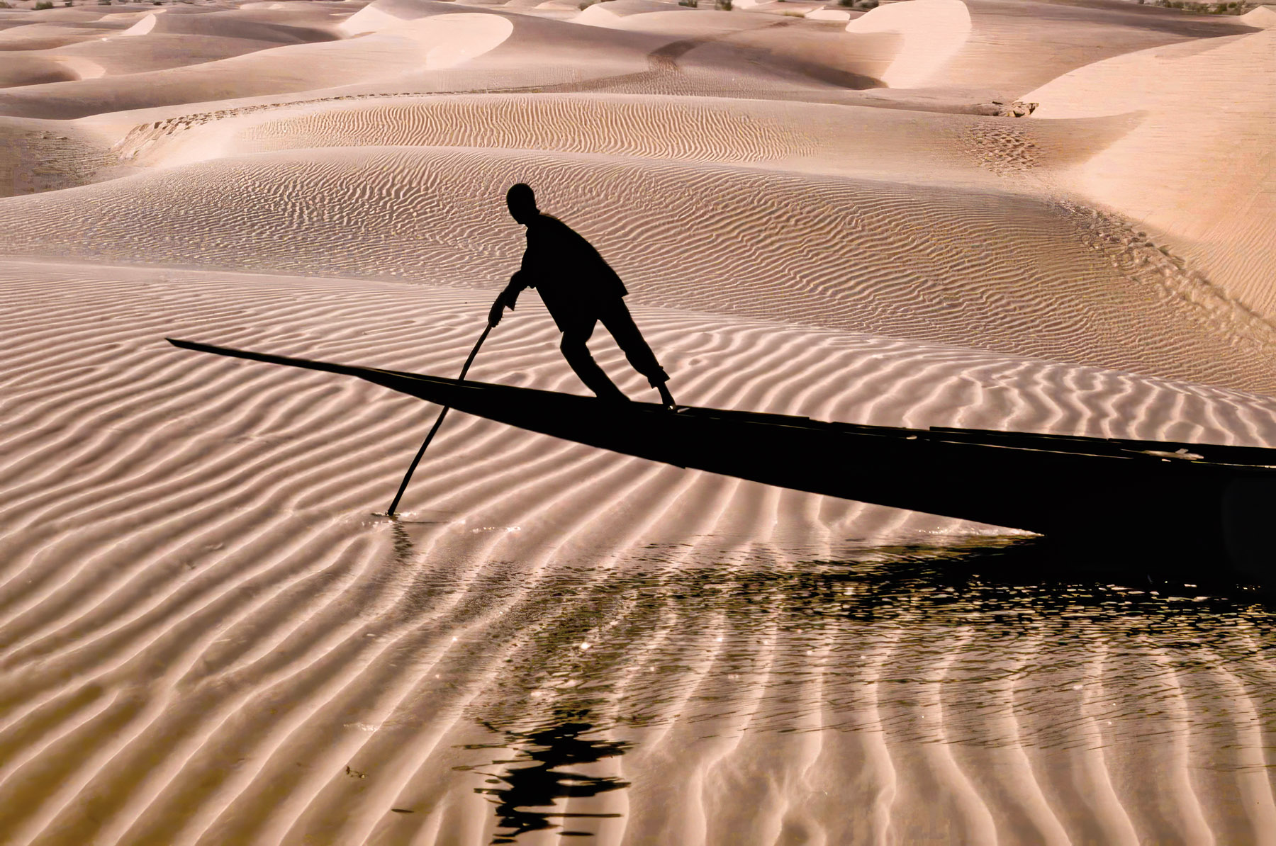In this image taken in 1993, I sandwiched two original slides together, one a high-contrast silhouette image of a boat on the Senegal River separating Senegal and Mauritania, the other a photo of wind-carved sand dunes taken in the same vicinity. The result is more than an illusion—the visual poetry and fusion of these two realities is a metaphor for Mauritania itself, where the Sahara Desert meets the Atlantic Ocean, and where nomads and fishermen live side by side.