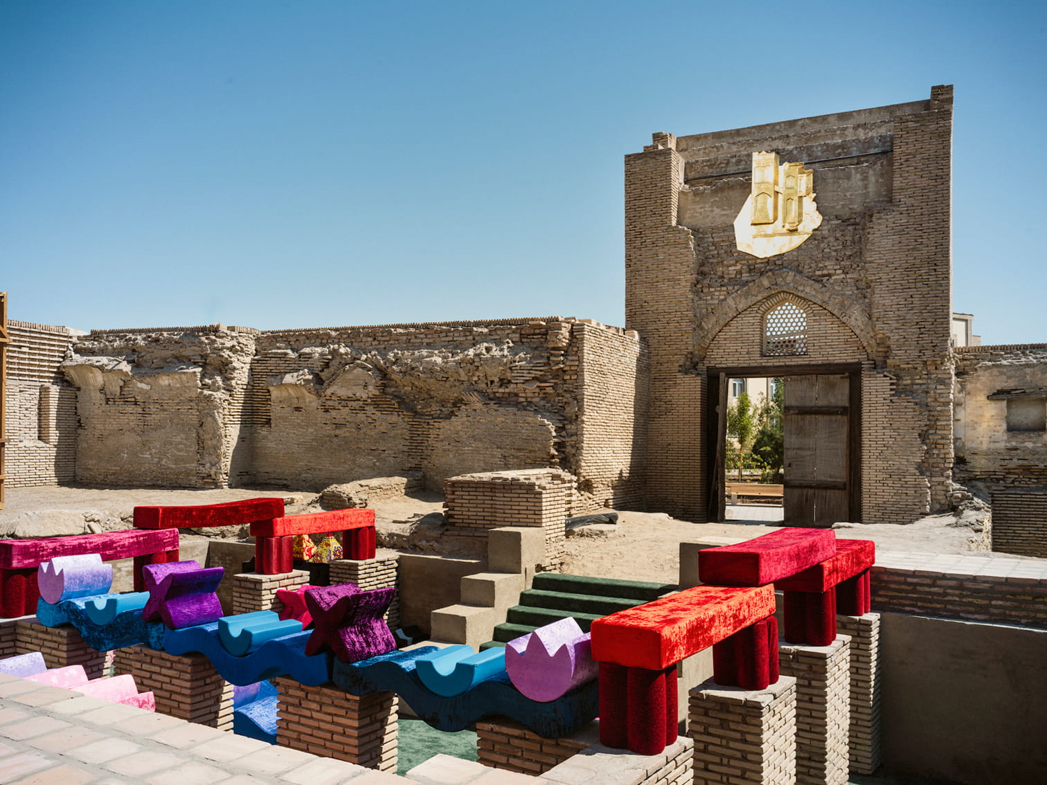 Every work is site specific and focused prominently on incorporating the traditional crafts of weaving, tapestry, ceramics and mosaic—all of which continue at the heart of the Uzbek creative scene and reference Uzbek traditions and rituals. The artworks guide the visitor to the city’s ancient structures, such as the 11th-century Rabat-i Malik caravanserai; the city’s bazaar; the Rashid Madrasa, a historical Islamic educational institution; the Gavkushon Madrasa, a 16th-century center for learning; and the 16th-century Khoja Kalon Mosque.