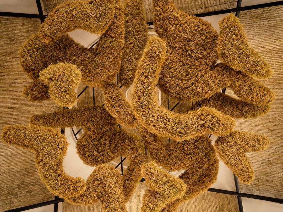 Uzbek artists Munisa Kholkhujaeva and Anton Nozhenko merge traditional craft and heritage with contemporary forms in “Bloom and Decay,” a chandelier of medicinal flowers.