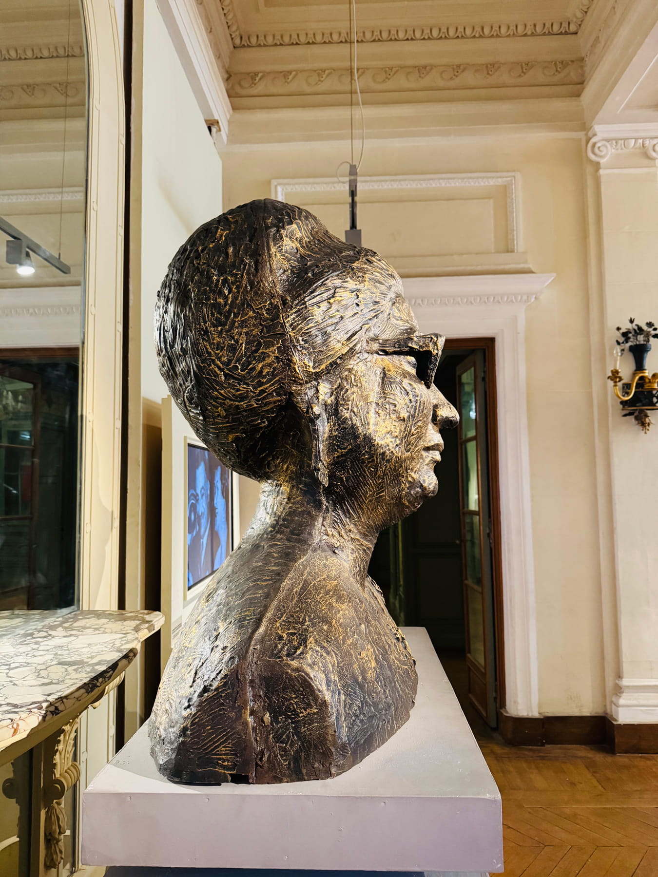 A sculpture of Umm Kulthum is displayed at Aisha Fahmy Palace in Cairo, which hosts an exhibition dedicated to the famed singer till mid-November 2025.