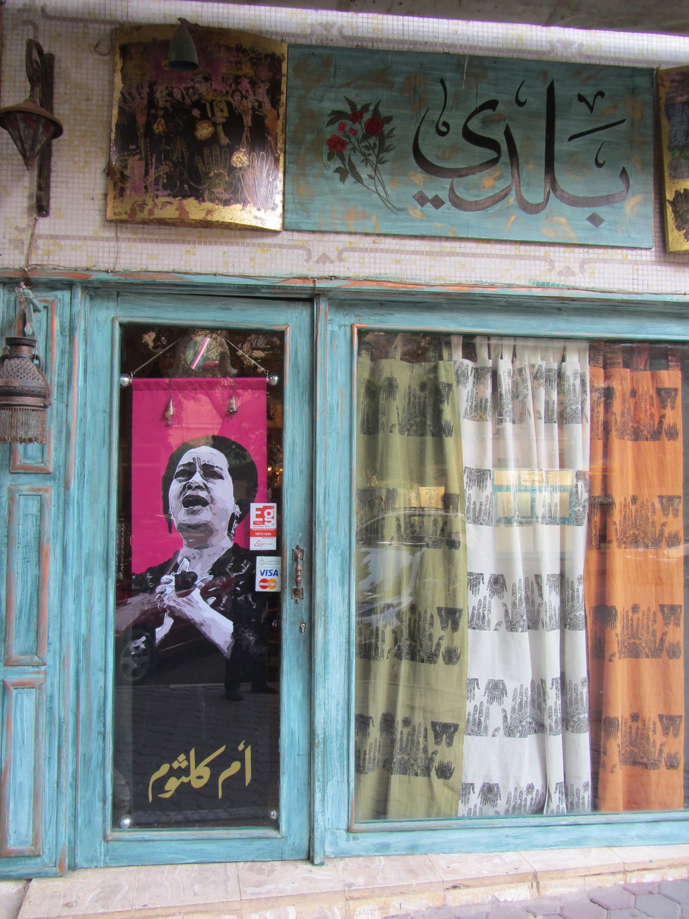 A high-end art shop in Cairo displays a poster of Umm Kulthum on its door.