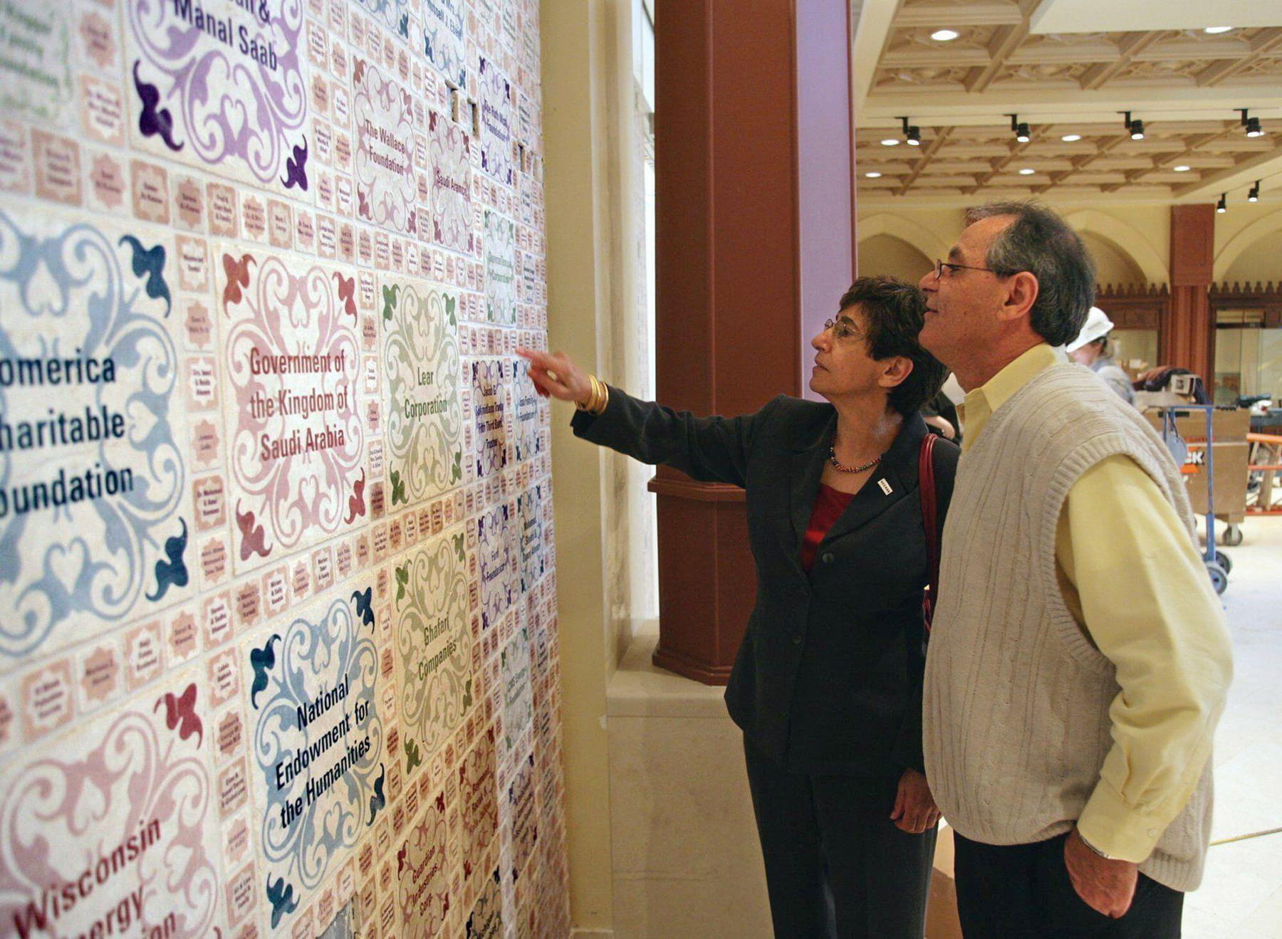 Ahead of the Arab American National Museum’s opening in spring 2005, original Director Anan Ameri and Saad Shafie look for Shafie’s name on a wall commemorating people and organizations that made the museum possible.