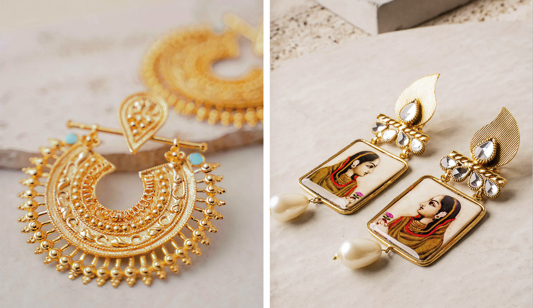 Left Signature Collection gold earrings carry influences of various cultures and eras. Right Mughal-era portraiture of women inspires some HUR pieces.