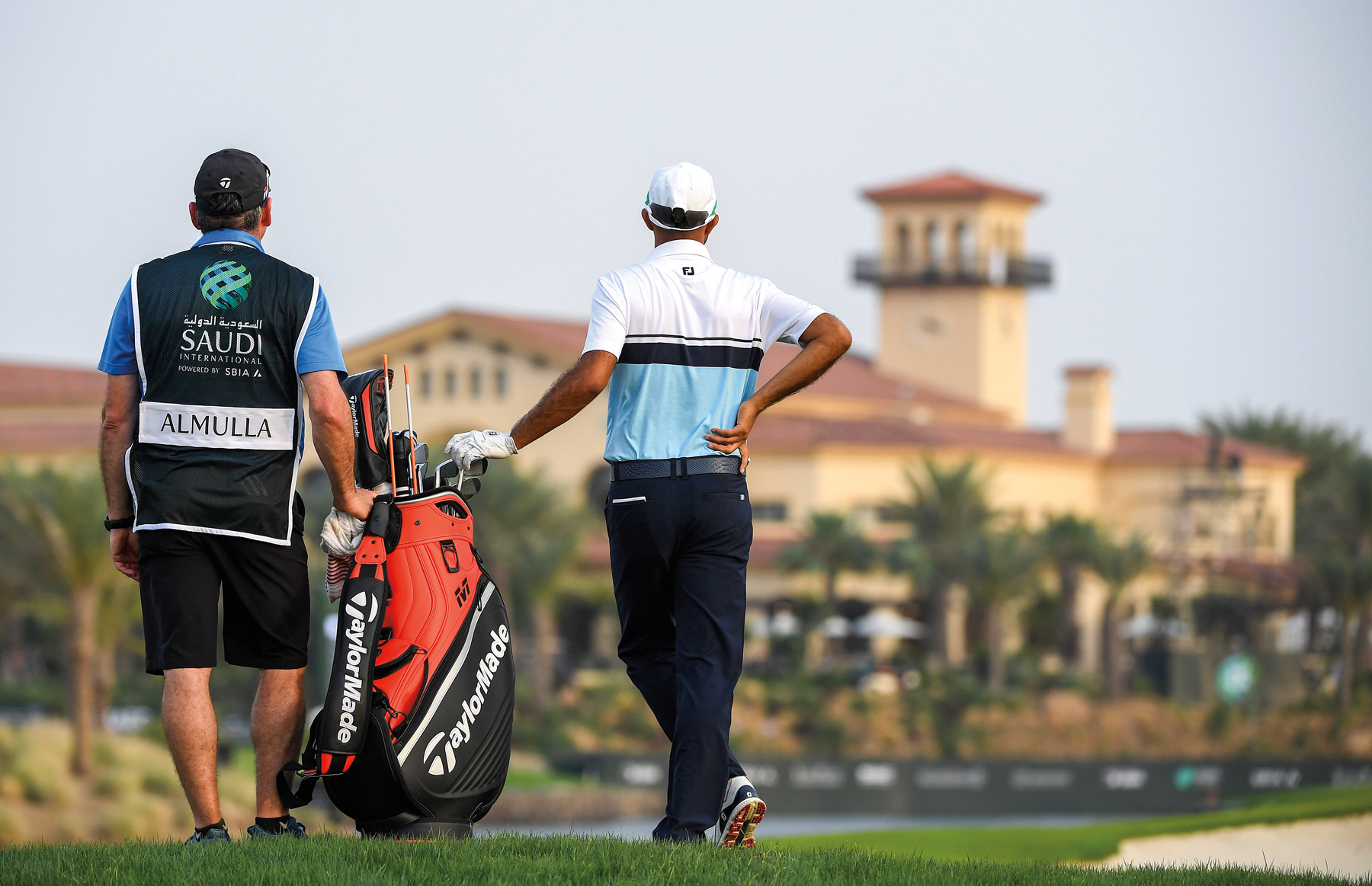 A caddy and Almulla assess the 18th fairway during the first round of the PIF Saudi International in 2019.