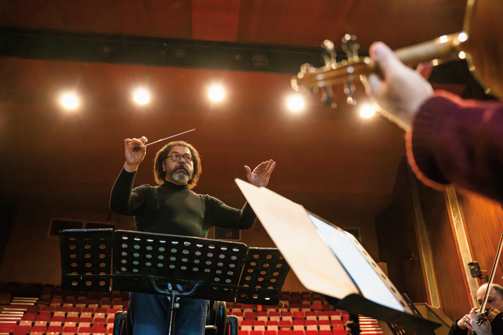 Cellist and chief conductor Karim Wasfi leads the Iraqi National Symphony Orchestra through a rehearsal at the Alrasheed Theater in Baghdad.