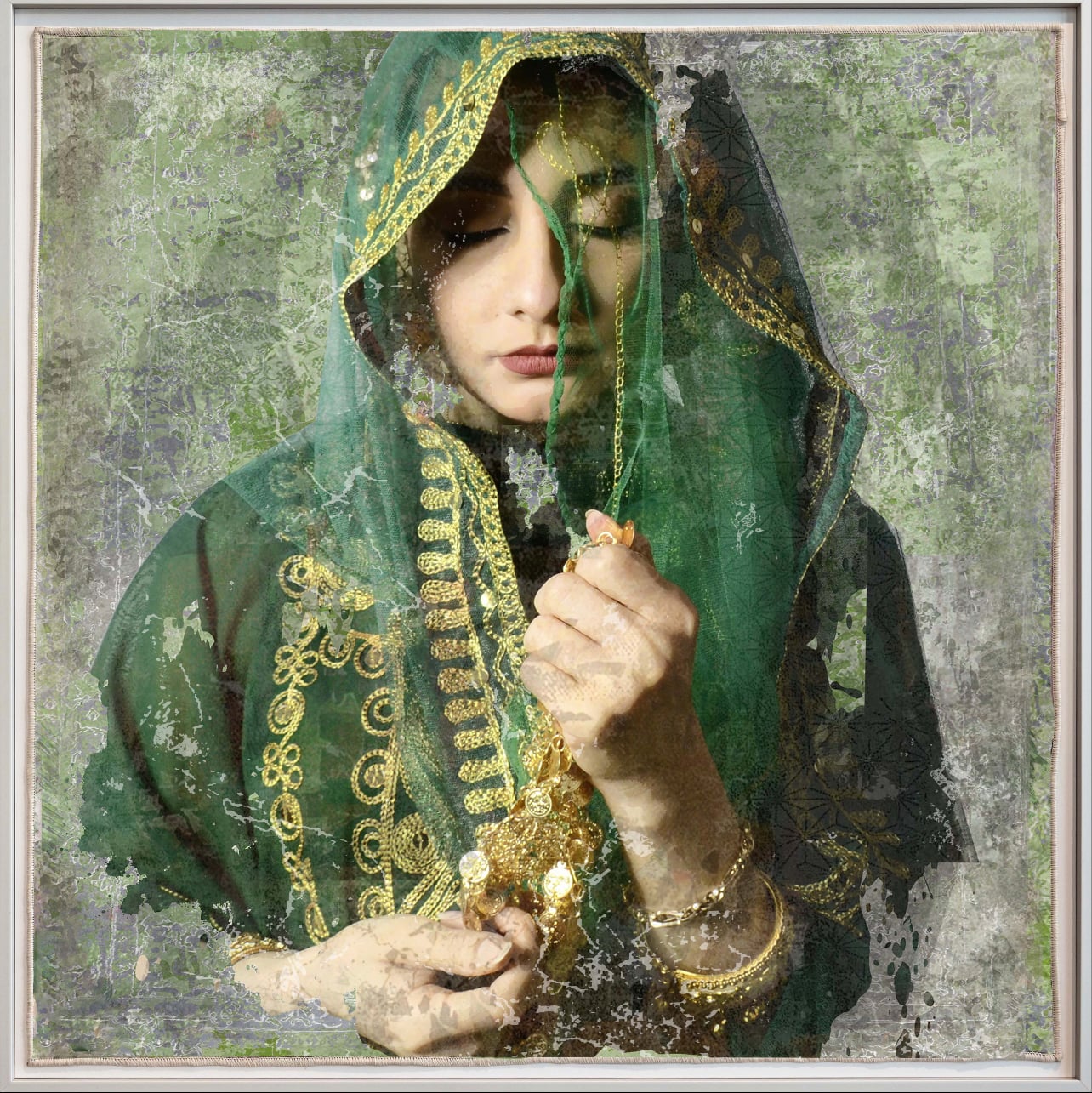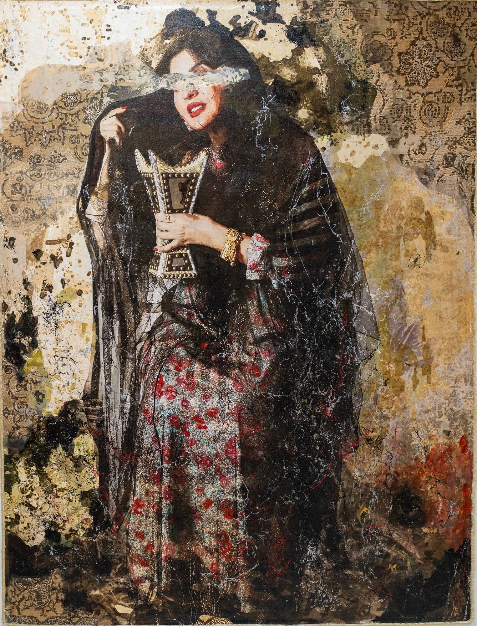 Women remain central in Al-Nemer's works, layered with identity and heritage. The iconic body becomes a focal point for stories and ornamentation. Often women appear with covered eyes or one eye hidden, while their hands hold traditional objects—poised between fragility and strength, silence and deferred speech.