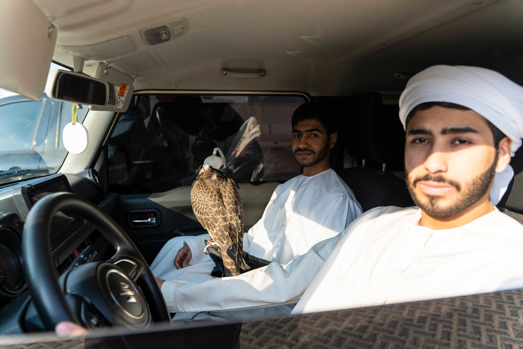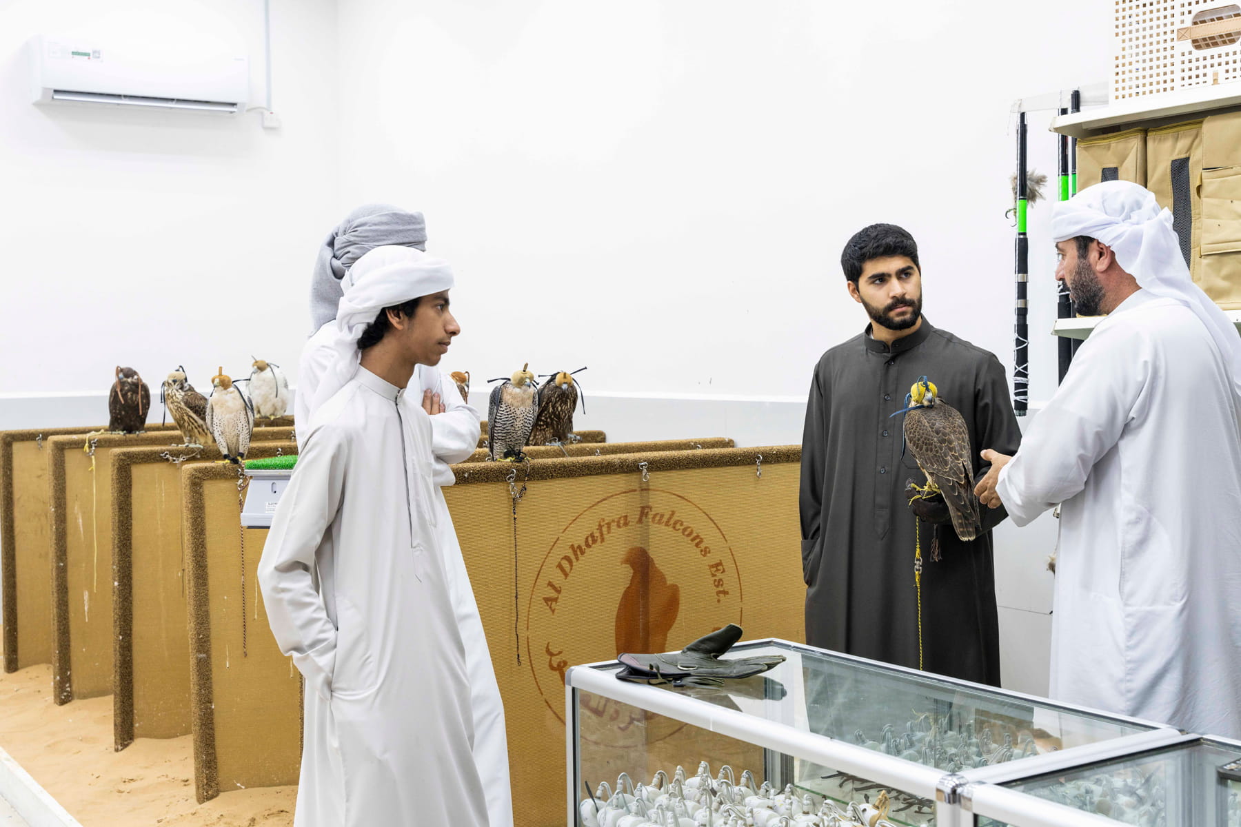 Two falcon owners enjoy their purchase the Falcons Shopping Center in Abu Dhabi, UAE.