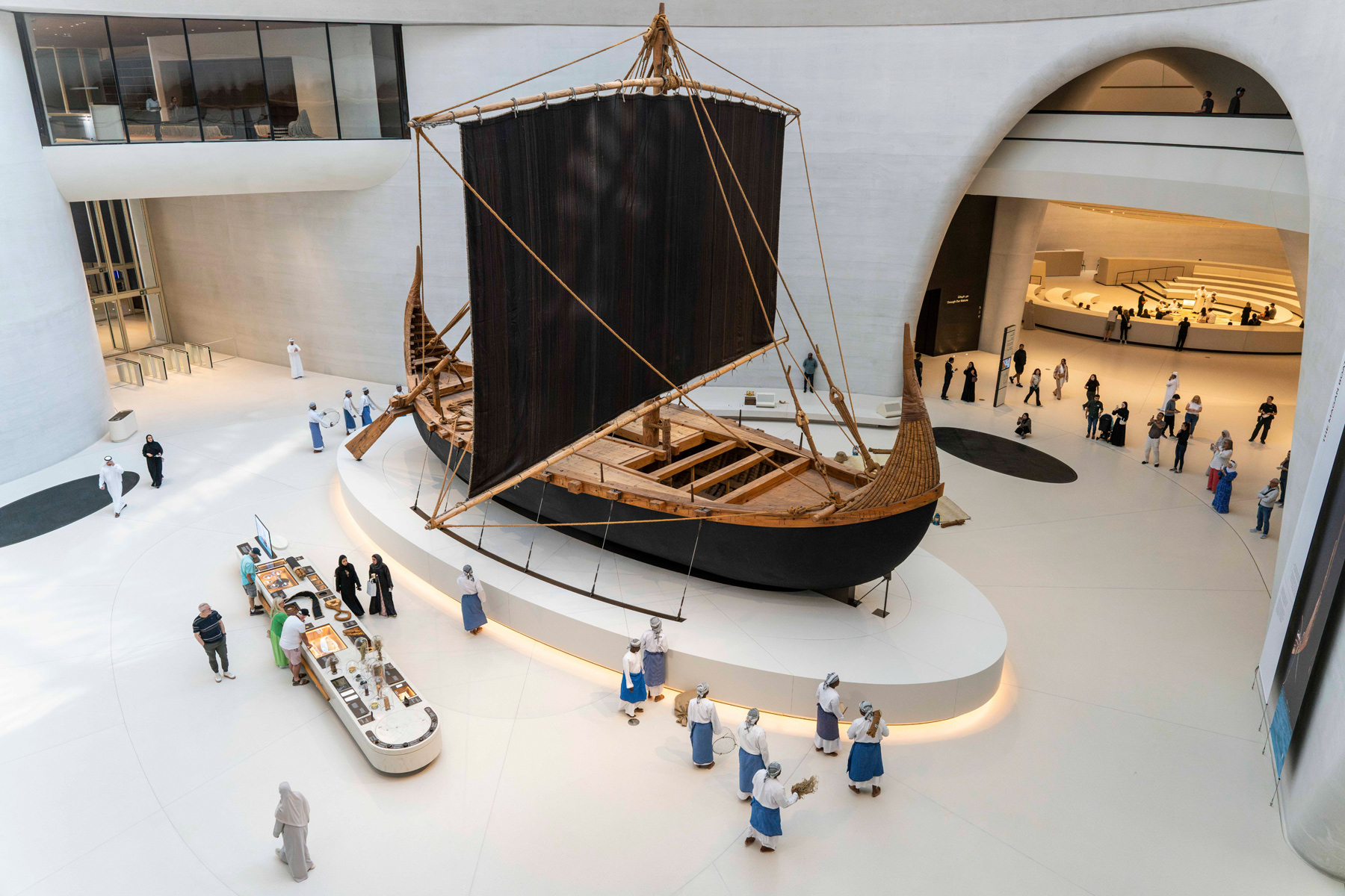 Upon entering, visitors encounter the Magan Boat, a full-scale 18-meter (59.1-foot), 4,000-year-old Bronze Age trading vessel built using traditional methods and materials such as date palm rope, reeds and bitumen. It was re-created through research drawing on ancient texts and archeological evidence-reflecting the UAE's maritime history and ancient trade networks.