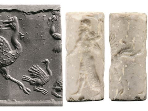 Compact in size yet complex in the scenes they depict, stone cylinders—many no larger than your thumb—were a popular medium for Mesopotamian artisans talented enough to reverse-carve semiprecious stones and produce unique, often mythological tableaux in astonishingly sensitive, naturalistic detail. Their craft gave each seal’s owner a personalized graphic signature for use with the most popular media channel of the third millennium BCE: damp clay. Seal impressions certified ownership, validated origins, attested to debts, secured against theft and more. Many seal cylinders were drilled so they could be strung and carried as amulets and status symbols—uses that may find echoes among today’s compact, personalized communication devices.