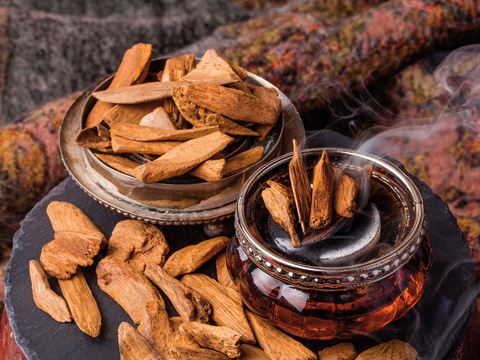 Musky and sweet, oud wafted its way into the culture of the Arabian Gulf from South and East Asia. Now the resin that is processed into an essential oil is sweetening perfume and room fragrance in the West.