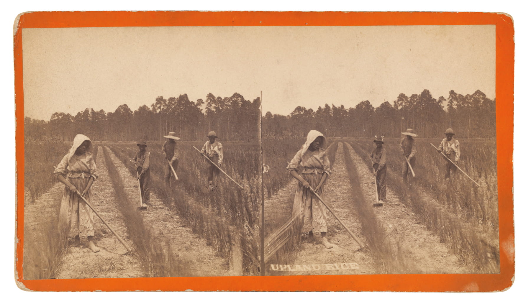 In an albumen silver print mounted to a stereographic card, photographer O. Pierre Havens shows upland rice being grown and harvested in the 1880s in Savannah, Georgia. (The J. Paul Getty Museum)