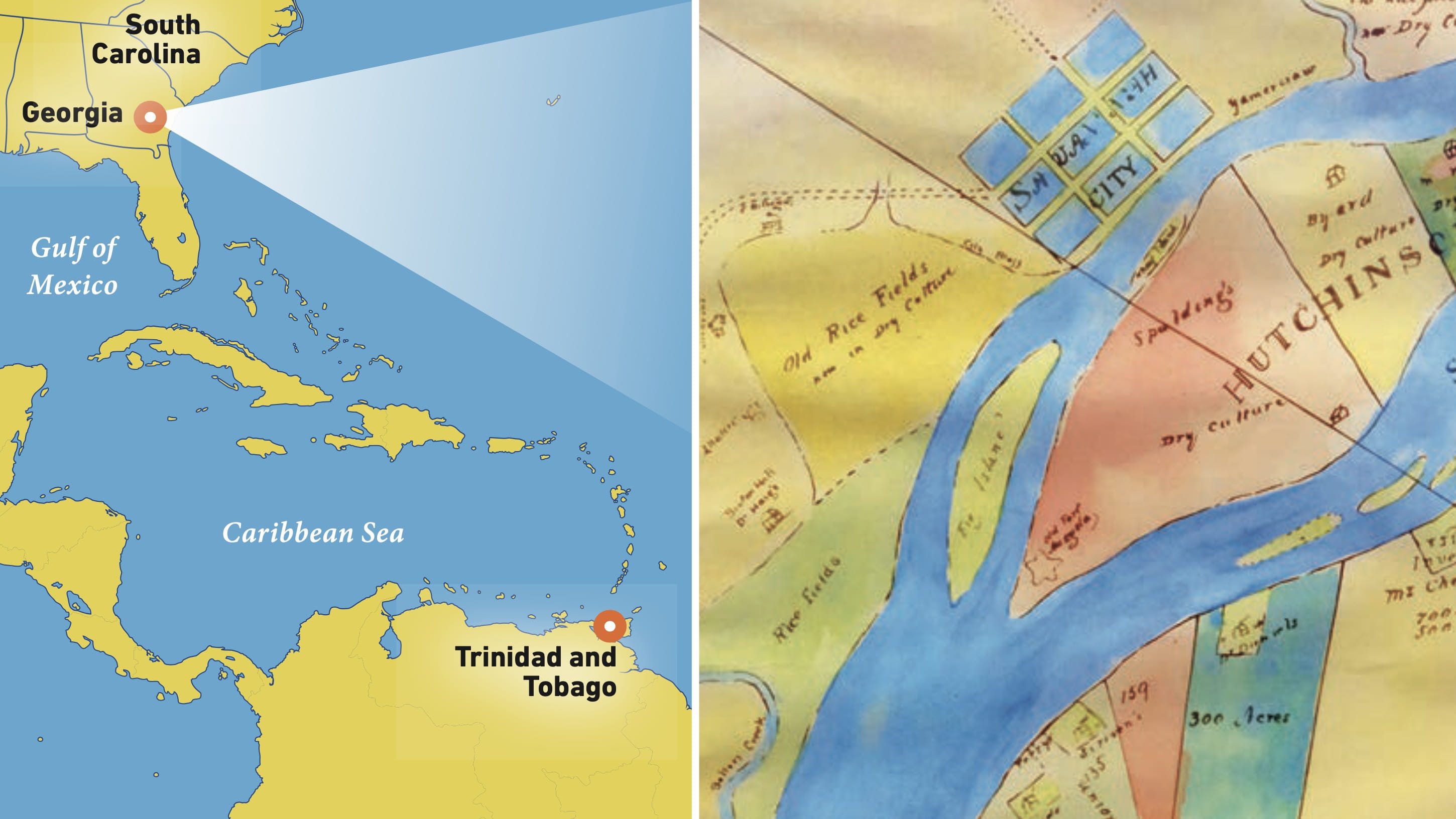 A historical map of rice planting in Savannah, Georgia, shows former rice fields along the Savannah River.